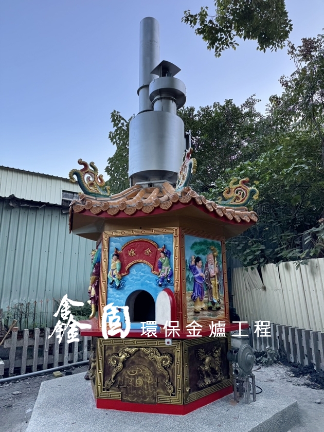 金爐內部以SUS304不鏽鋼成形,外觀彩繪裝飾。單層水洗環保設備可以淨化焚燒金紙時所產生的灰燼